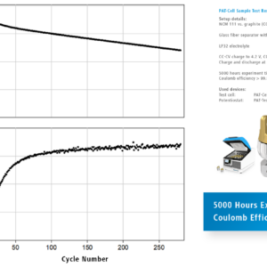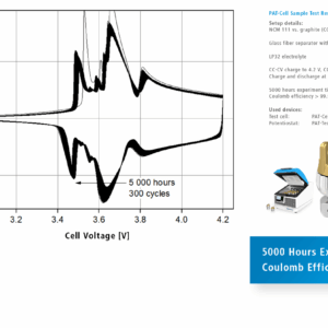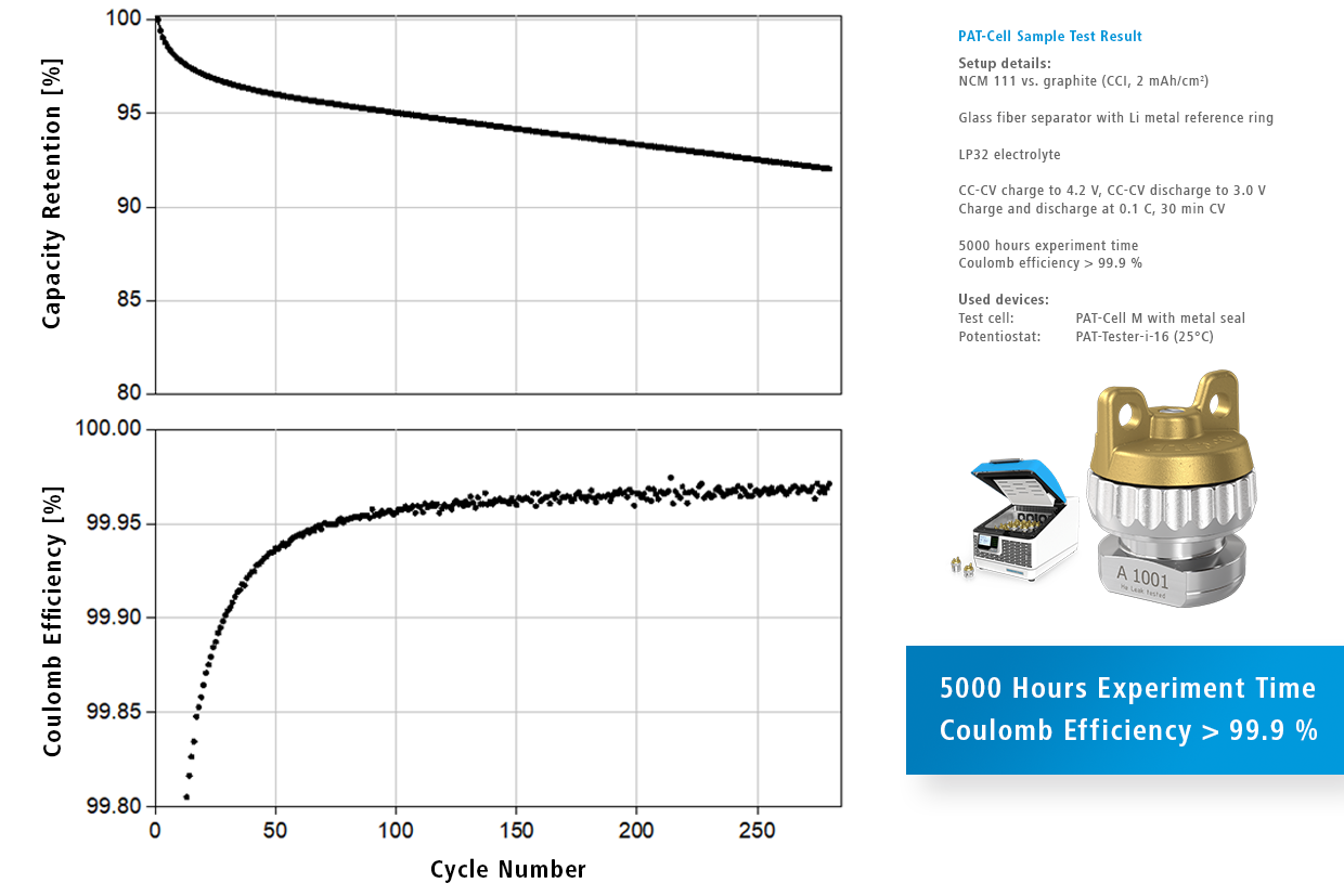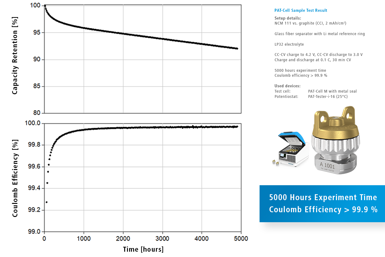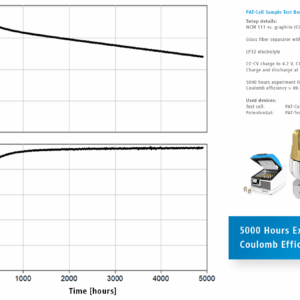 For long-term testing ( > 2000 hrs) with two or three electrodes Cableless cell design for easy handling and fast assembly Interchangeable lid springs for easy force adjustment Optimized lid for use with metal seals (PAT-Cell M) PAT-Button for automatic cell identification in EL-Software